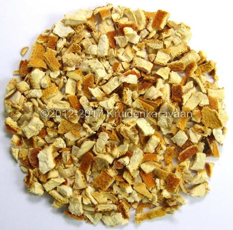 Gedroogde stukjes sinaasappelschil geven meer smaak af dan verse sinaasappel. Lekker in combinatie met zwarte of groene thee of met pure rooibos.
